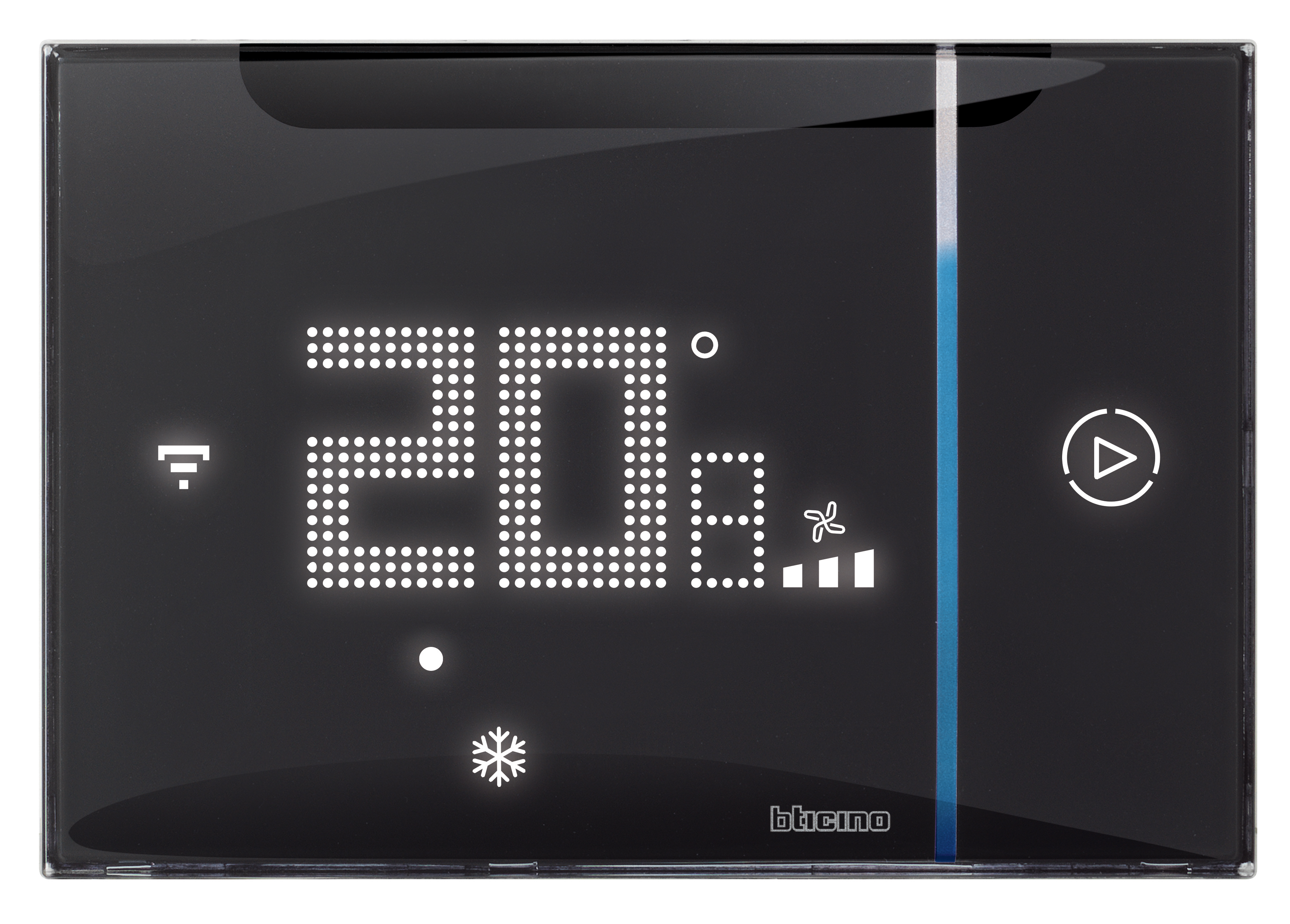 Smarther AC with Netatmo is the connected thermostat for HVAC systems. It can directly manage a single wall unit thanks to the on-board IR emitter, while with the use of the dedicated accessories, it can easily handle more extended systems with several air conditioning units and Fan Coils. The device can be used to manually set the required temperature level, the fan speed and Boost mode, which allows to force the switching on of the system for a limited period of time (15, 30 or 45 minutes) irrespective of the set or programmed temperature. It can also display the temperature and humidity measured in the room. When used in conjunction with the Home + Control App, it allows simple and intuitive temperature programming and management. Thanks to its Wi-Fi connection, Smarther AC with Netatmo can be programmed and controlled remotely. Smarther AC with Netatmo can also be controlled with the Google, Amazon Alexa and Apple HomeKit voice assistants. Smarther AC with Netatmo flush mounted version XW8003/XM8003/XG8003/ 0 490 43/0 490 44. The device is compatible with the Italian (500/503E/502PB), French and British (UA1) standard boxes. Smarther AC with Netatmo wall mounted version XW8003W/0 490 45. It can be installed on the wall, using screws and dowels suitable for the installation surface. You can have up to 10 thermostats in your system. Depending on the type of installation, a single Smarther AC with Netatmo can control (through RF): A)up to 10 connected IR emitter (all with the same communication protocol and located in up to 10 rooms of the Home + Control App). In this case, the Smarther AC on-board IR emitter can be disabled, or it can be used in parallel with the IR emitters for the control of another air conditioning unit. B)up to 5 HVAC actuators, provided that they are all in the same room and that the controlled Fan Coils are all of the same type.